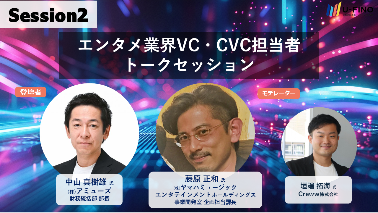 中山 真樹雄 氏(株式会社アミューズ 財務統括部 部長) ●事業内容 俳優・ミュージシャンなどの アーティストのマネジメント を中心とし、舞台や映像、アニメ、コミック制作などエンタメ領域で幅広く事業を展開。 ●プロフィール 出版社勤務などを経て2003年に株式会社アミューズに入社。 以来、経営企画を中心にキャリアを重ね、経営企画部長、人事部長を経て、 現在はスタートアップ投資やM&A、それら投資先の管理を中心に、7月より経理財務部と統合し、経理・財務業務も所管する財務統括部長を務める。 藤原 正和 氏(株式会社ヤマハミュージックエンタテインメントホールディングス 事業開発室 企画担当課長) ●事業内容 出版事業,音楽配信事業,音楽プロダクション事業,音楽出版事業,レーベル事業 ●プロフィール 2009年入社。制作ディレクターを経て、自社ECの企画運営・渉外を担当。音楽教室や顧客管理基盤の開発など様々なプロジェクトに参画した後、2022年から事業開発室でスタートアップ投資に従事。専門領域はプロジェクトマネジメント。趣味は海釣り(おかっぱり)。好きなアーティストはFrank ZappaとTWICE。 <モデレーター(予定)> Coming Soon...