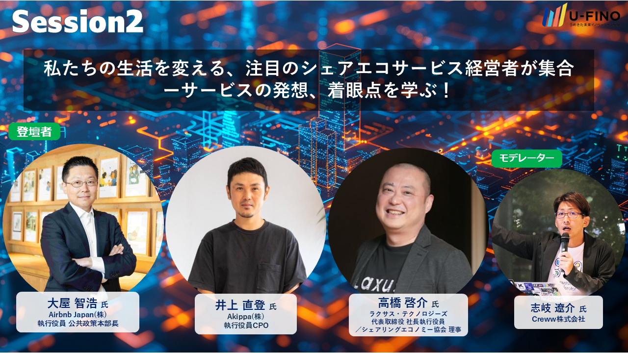 Session1では、一般社団法人シェアリングエコノミー協会 関西副支部長・東海支部長が登壇し、シェアが社会に根づくまでの歩みと、持続可能な仕組みへ育てる視点を共有します。Session2では、Airbnb の 大屋智浩 氏と、akippa の 井上直登 氏が登壇。「使われていない資産」を価値へ変える発想と社会実装のリアルを語ります。Session3では、シェアエコ領域で成長を目指すスタートアップがピッチを実施。多様な分野でのビジネスモデルと連携ニーズを提示し、次の共創へとつなげます。