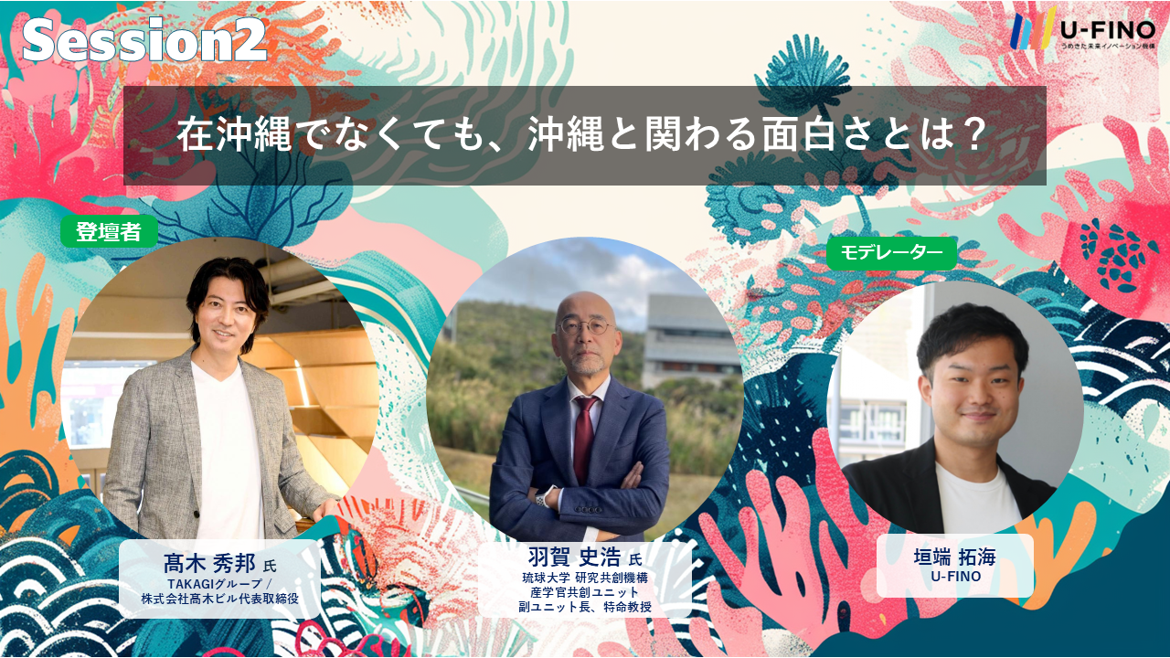 登壇するのは、TAKAGIグループ/株式会社髙木ビル代表取締役の 髙木 秀邦 氏 と、琉球大学にて産学官連携や大学発スタートアップ創出を推進する 羽賀 史浩 氏。髙木氏は、コワーキング事業や伴走型投資を通じて全国・沖縄のコミュニティやスタートアップに関わるほか、沖縄発でテック領域の有望シードスタートアップへの中期投資を行う「津梁ファンド」への出資を通じてエコシステムにも参画。羽賀氏は陸上養殖拠点の活動を展開する琉球大学COI-NEXTにも関与し、産学官連携や共創拠点の形成を推進しています。