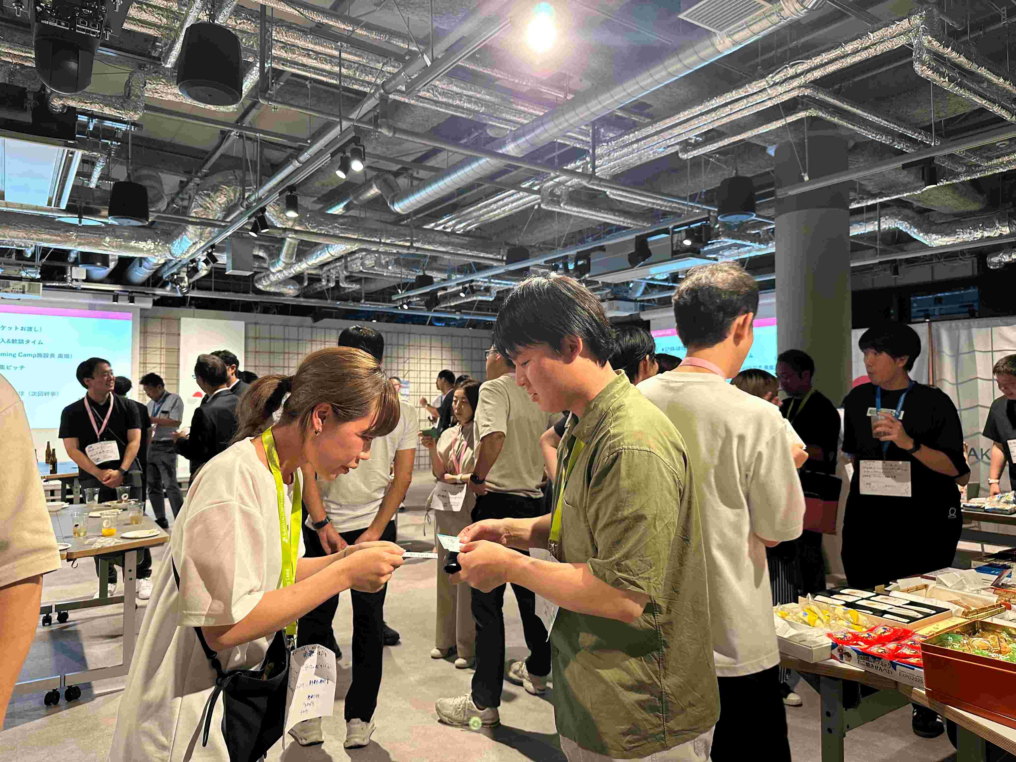 イベントの締めくくりとして、Blooming Campにて懇親会を開催。Blooming Campの施設長・奥畑さんの乾杯の挨拶でスタートした懇親の場では、全国各地から持ち寄られたお土産がテーブルを彩り、参加者同士の自然な会話のきっかけとなっていました。