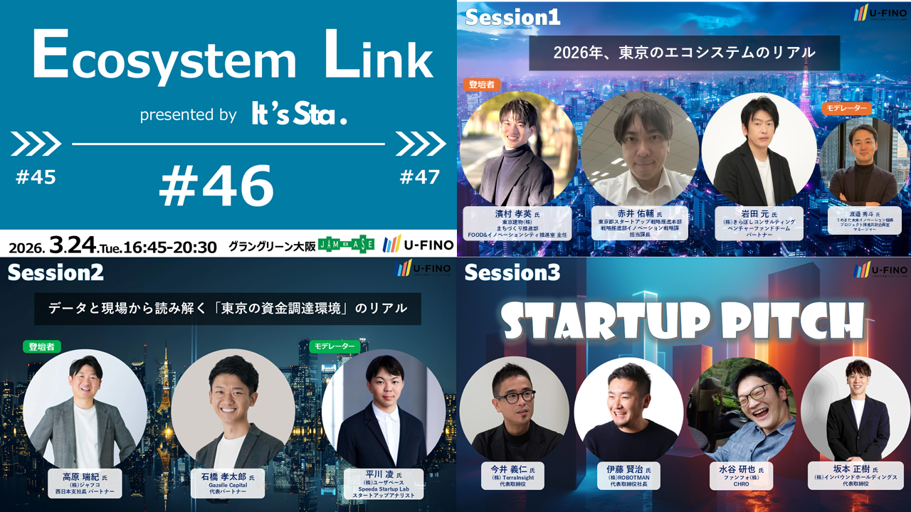 2026年3月24日に、グラングリーン大阪 北館 JAM BASEにて「Ecosystem Link#46」を開催いたしました。Ecosystem Linkでは、スタートアップ、事業会社の新規事業/オープンイノベーション担当者、金融機関、士業、行政、支援機関など、イノベーションに挑戦する方々が集い、情報や技術・知識等を共有し、自ら発信していくコミュニティであるIt's Sta.(Innovators & Trailblazers Synergy Station)のコンテンツの一つとして、スタートアップ・エコシステムに関するセッションと注目のスタートアップのピッチを行っています。